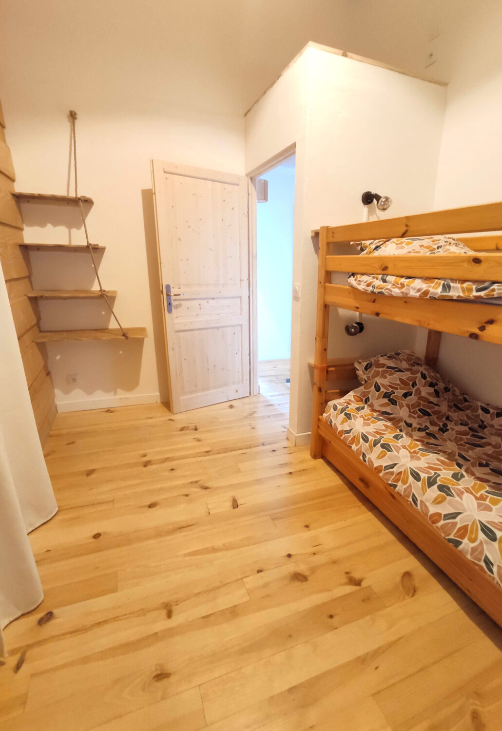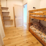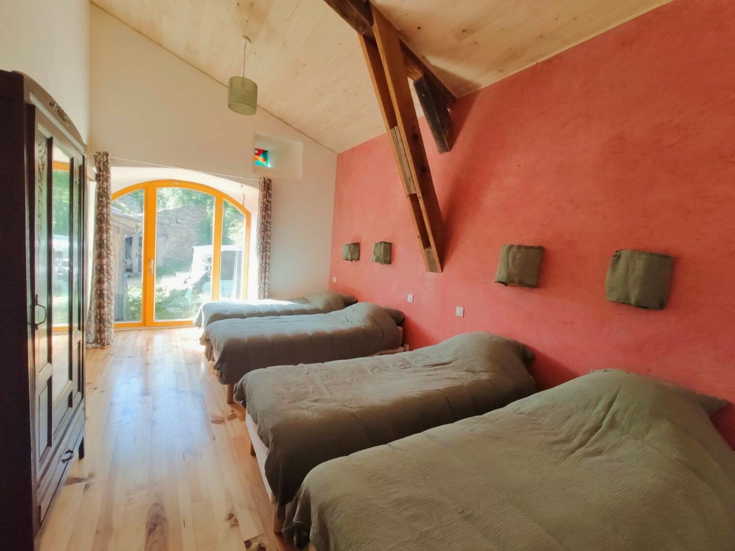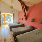 Chambre rose : 4 lits simples 80×200 ou 2 lits doubles 160×200. Une salle de bain avec toilettes sèches dans la chambre.