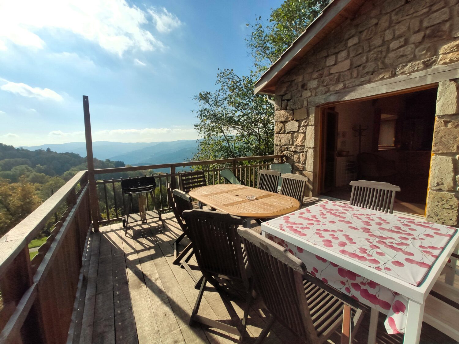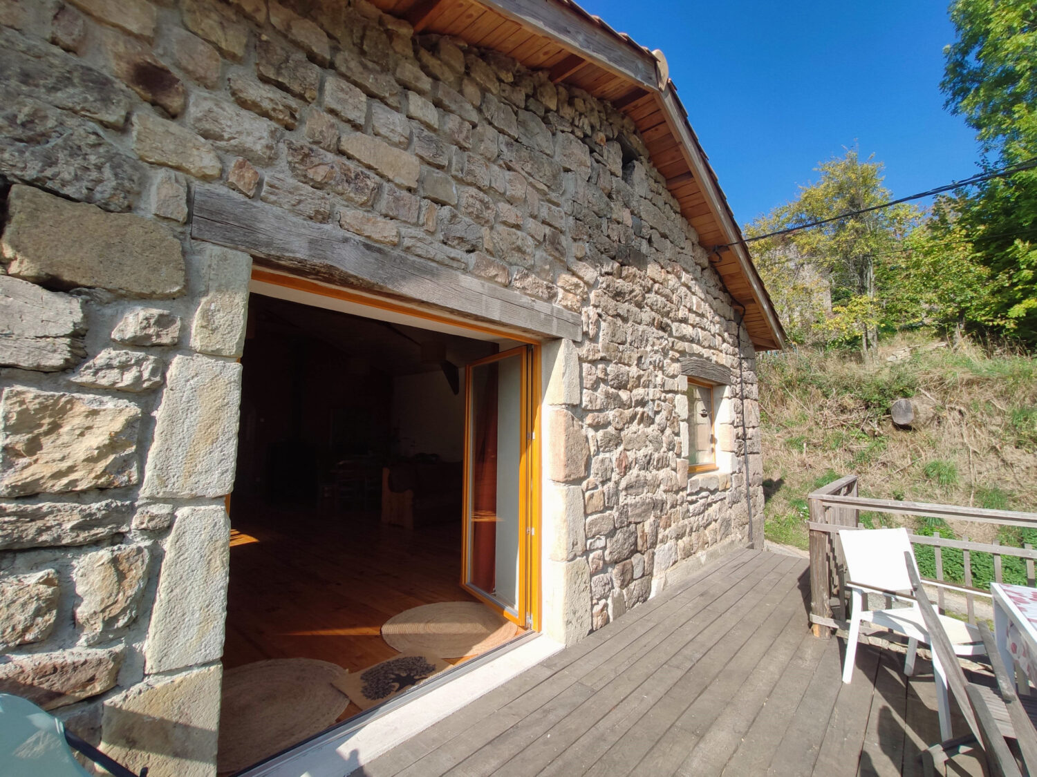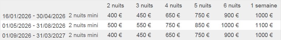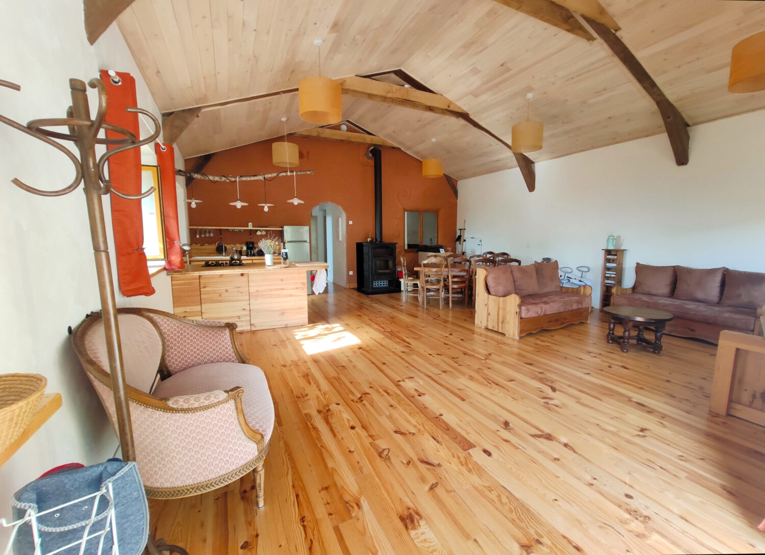 Équipements : Cuisine équipée, vaisselle, liquide vaisselle et produits lave-vaisselle, torchons, éponges, poubelles de tri et compost, kit de courses en vrac, poêle à bois, terrasse.