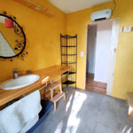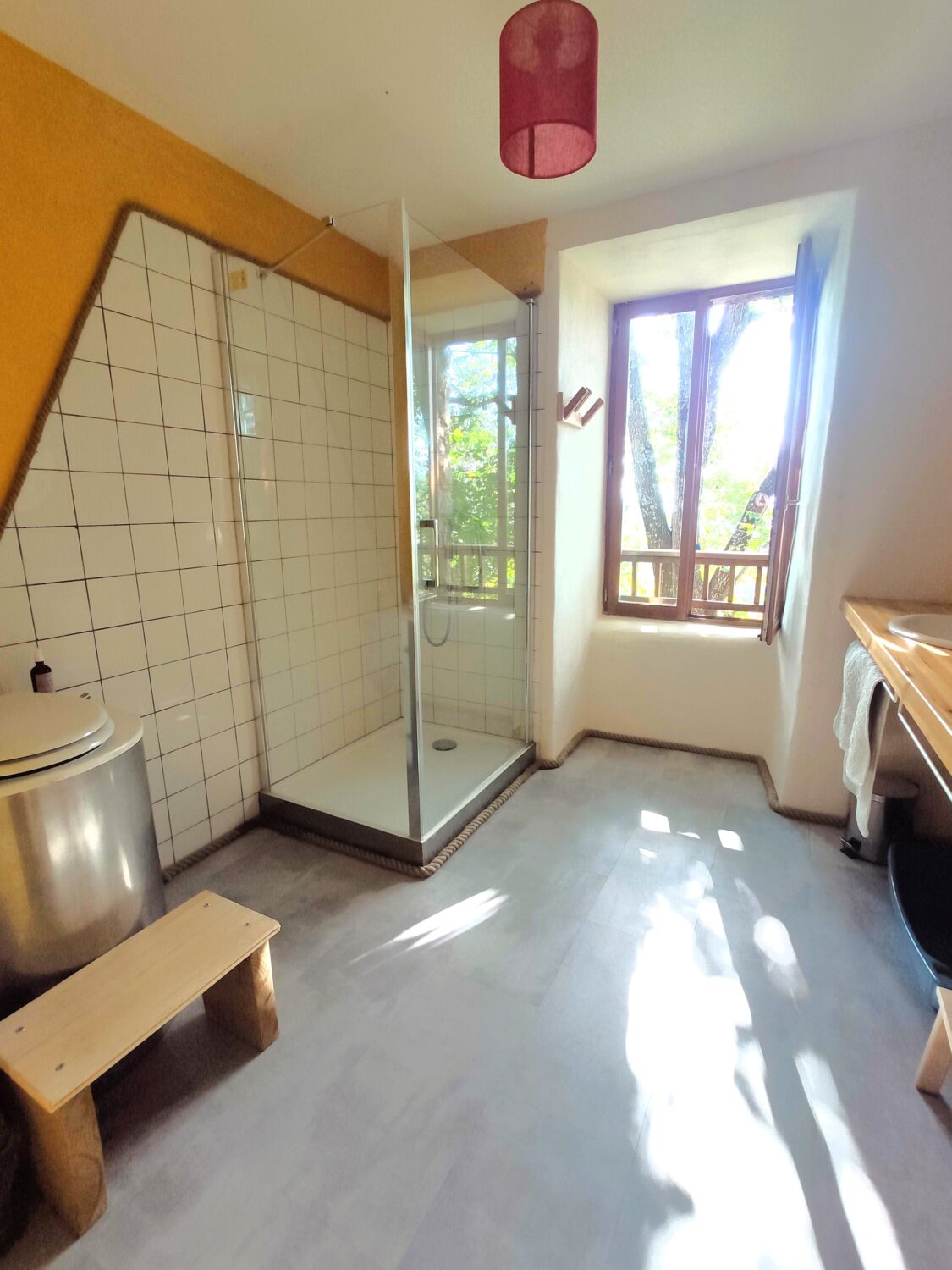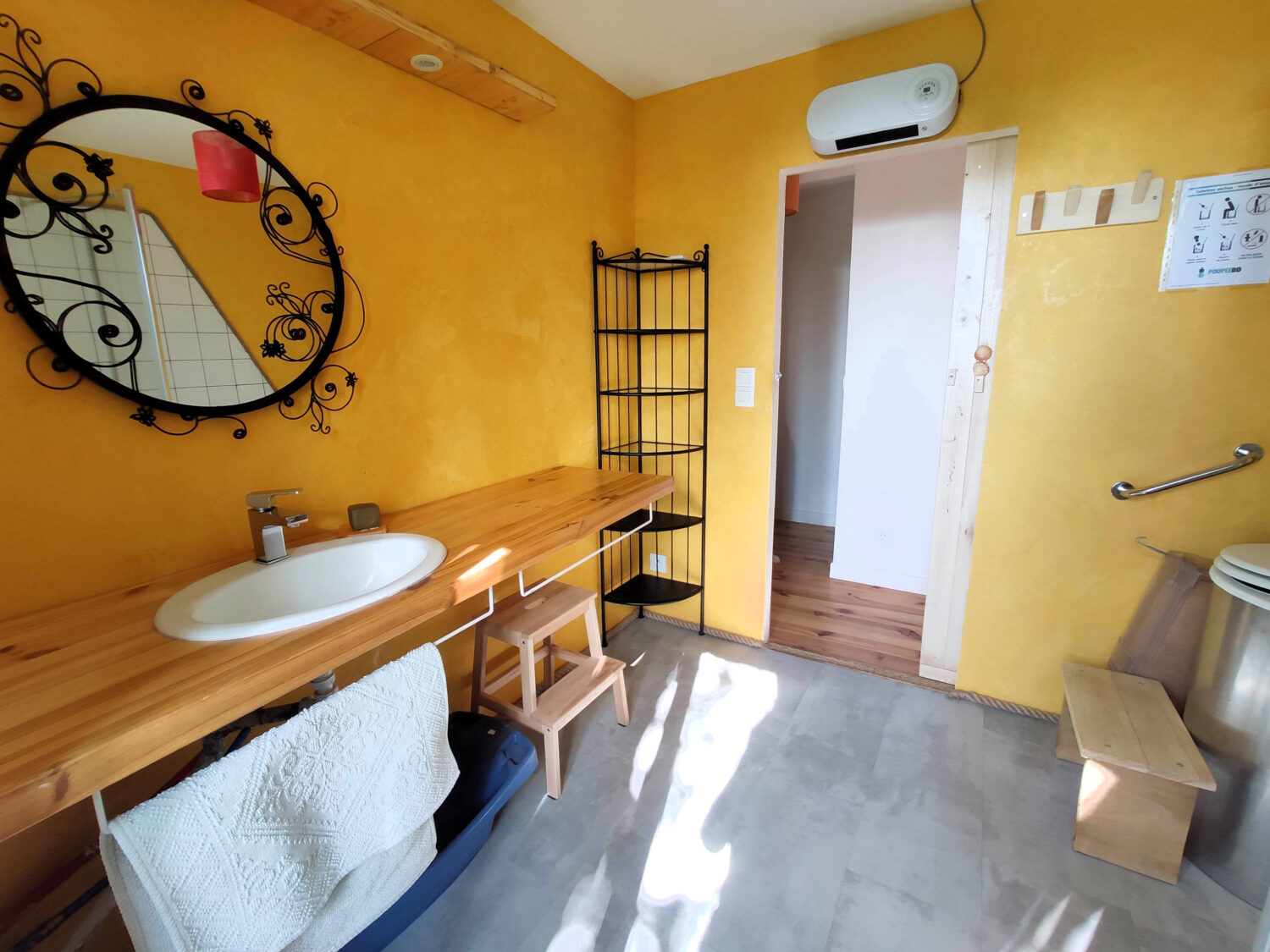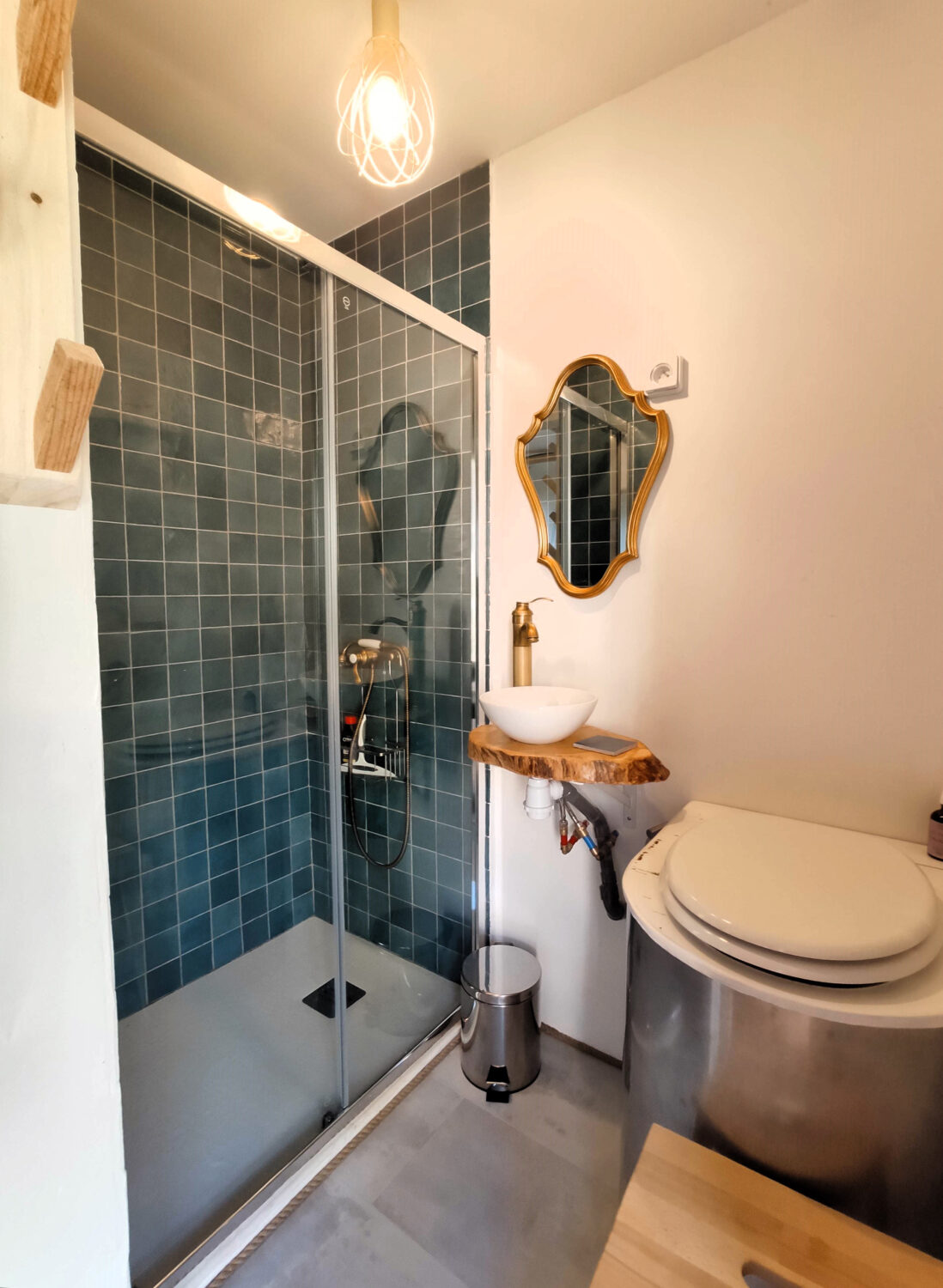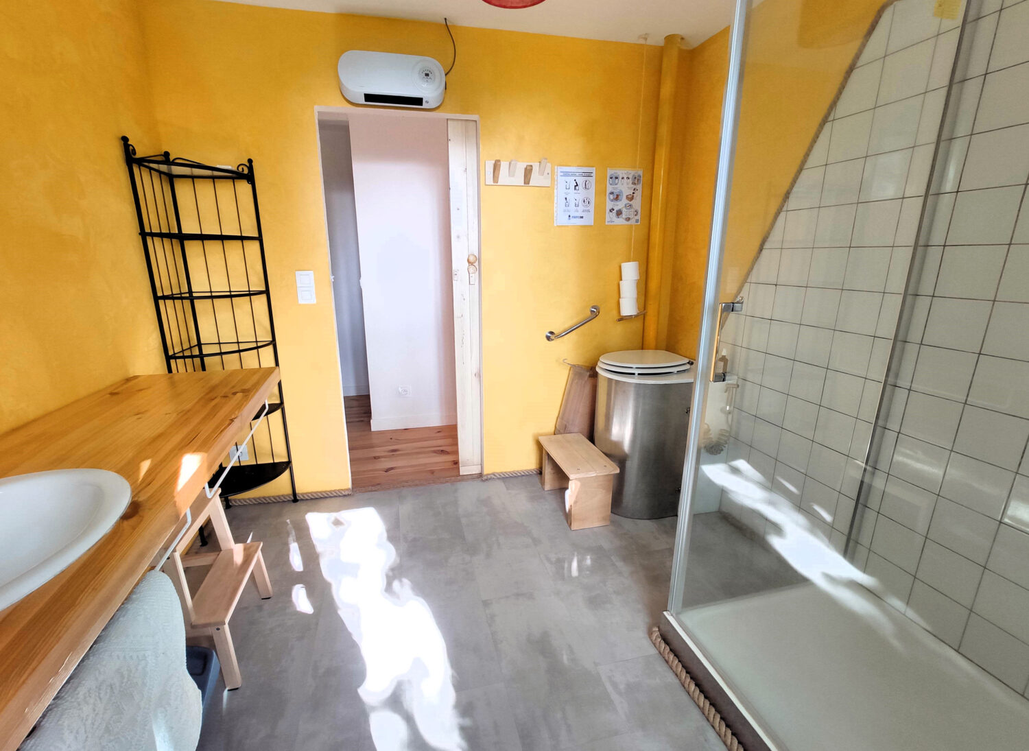 Nous avons fait le choix de toilettes sans chasse d’eau afin de limiter notre consommation en eau potable, qui est une ressource rare. Elles possèdent un séparateur d’urine, une douchette pour rincer le séparateur, un spray de lavande et un stock de copeaux. Après utilisation, rincez le séparateur avec la douchette, laissez un spray de lavande pour les suivant·es et mettez une louche de copeaux. Nous les vidons à la fin de votre séjour.